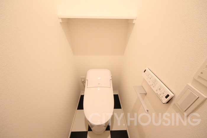 洗面台とトイレは白と黒のタイルがおしゃれ!