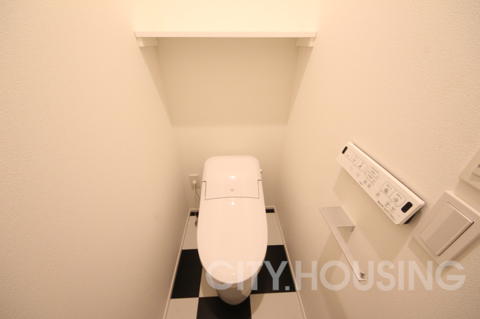 トイレと洗面所の床が白黒のモダンで珍しいデザインが特徴です。