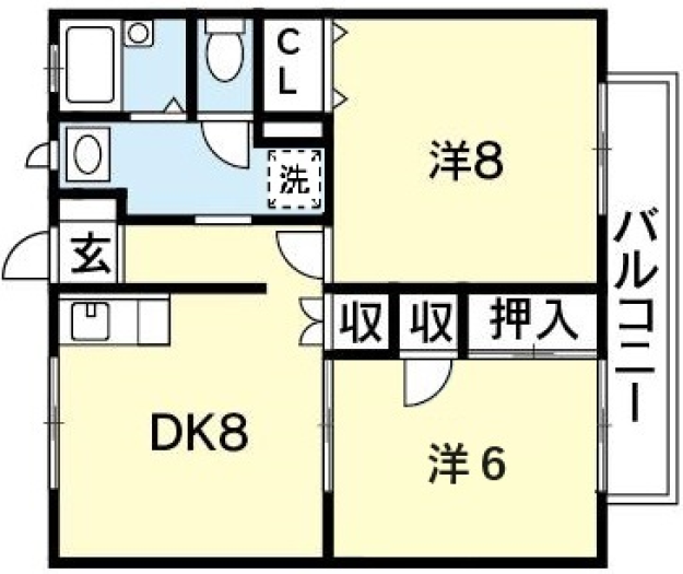 鉄筋コンクリート造、2DKの間取り。